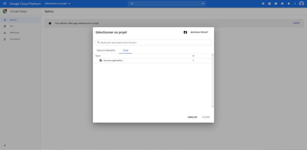 Dans le menu de navigation de Google Search Platform, cliquez sur l’onglet « Sélectionnez un projet ». Une fenêtre s’ouvre, cliquez sur « Nouveau projet ».