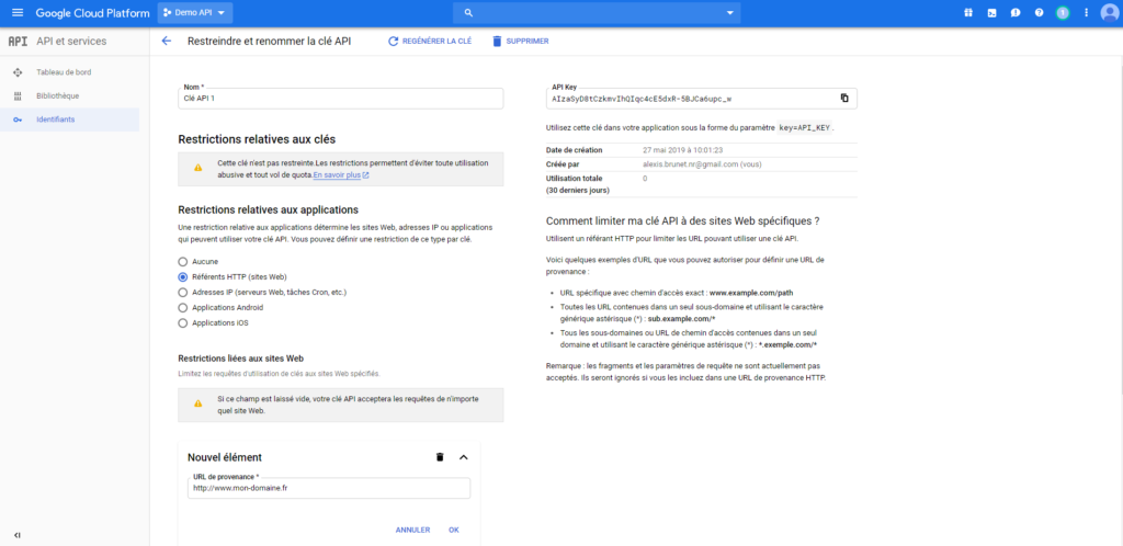 A faire : Cliquez sur « Restreindre la clé API », renommez-la en « Google Maps ». Puis dans « Restrictions relatives aux applications », sélectionnez « Référents http (sites web) ». Le but est de restreindre l’utilisation de votre clé API à votre site web uniquement. Pour finaliser cette restriction, ajoutez un élément et complétez par votre nom de domaine du type « http://www.mon-domaine.fr ». Enregistrez pour valider le paramétrage.