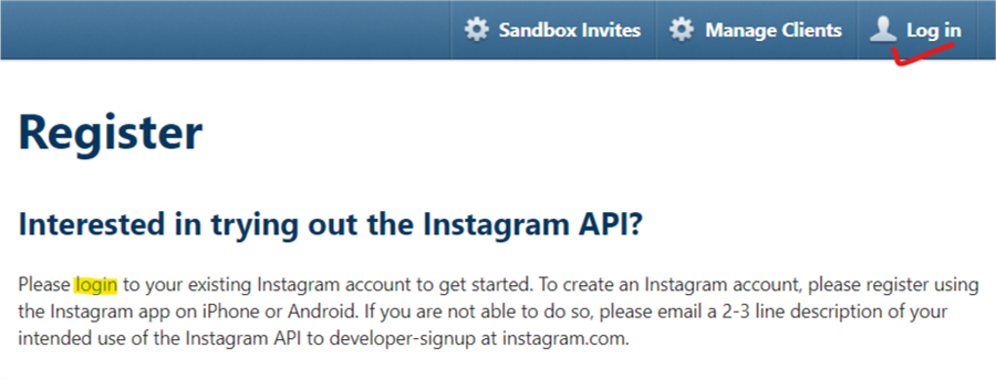 Suivez ce lien vers la page Web Instagram Developer et connectez-vous à votre compte.