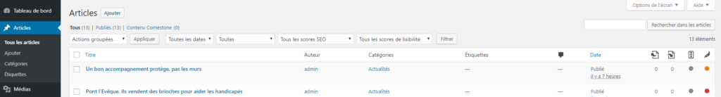 Les articles sont les actualités de votre site. Le CMS WordPress propose un système de gestion d’articles complet, disponible dans l’onglet Articles ➝ Tous les articles.