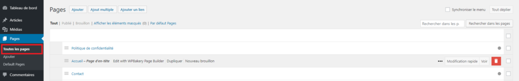 Le CMS WordPress propose un système de gestion de page complet. Celui-ci est disponible dans l’onglet Pages ➝ Toutes les pages.