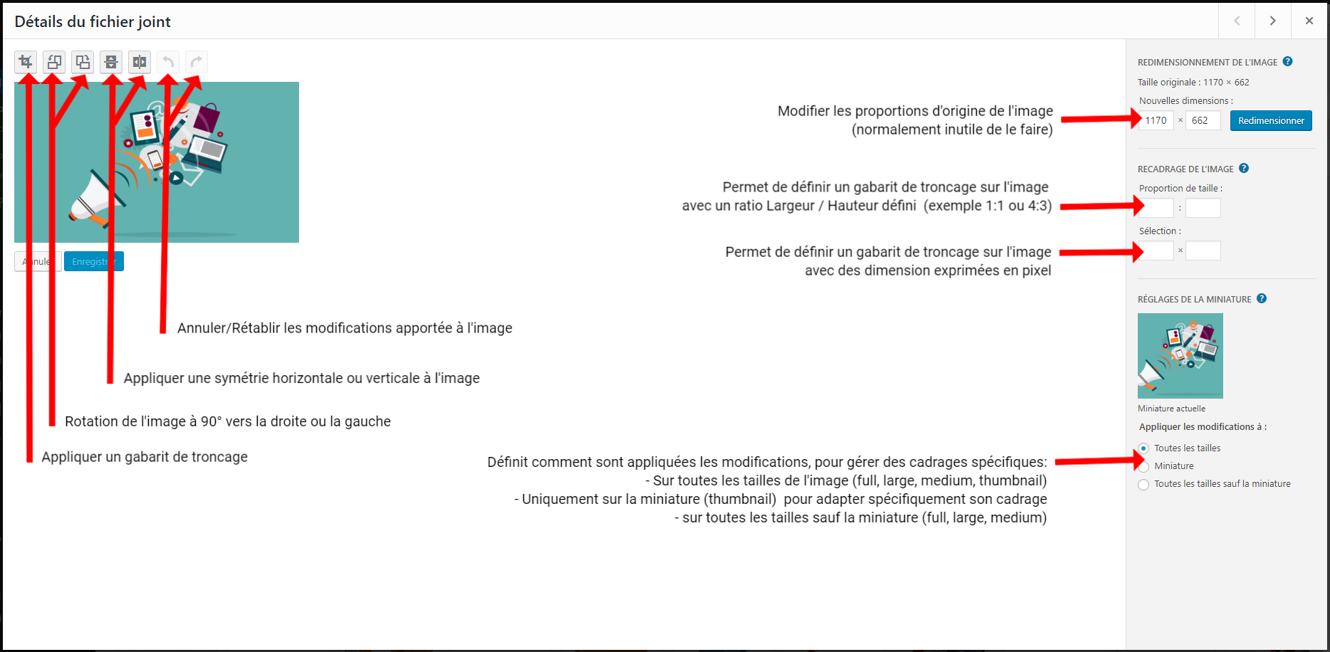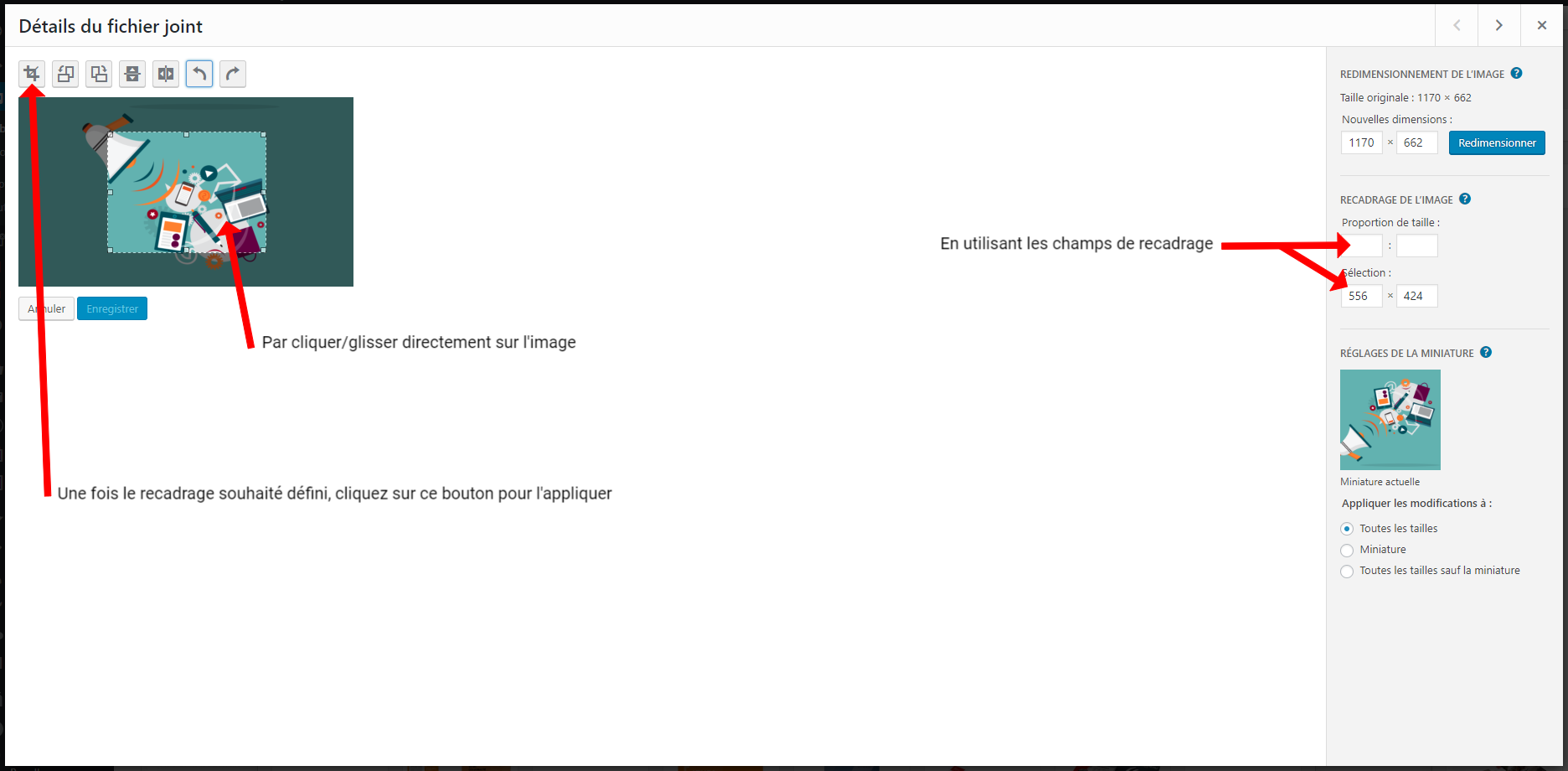 Si votre image d’origine n’est pas cadrée comme souhaité et que vous n’avez pas d’éditeur d’images à disposition (Ex: Photoshop), WordPress propose un outil pour vous permettre de le faire.