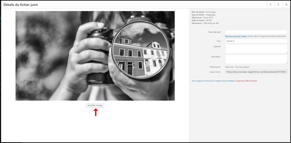 - Lorsque vous cliquez sur une image, une fenêtre s’ouvre avec les détails du média, et les actions possibles. Cliquez sur « Modifier l’image ».