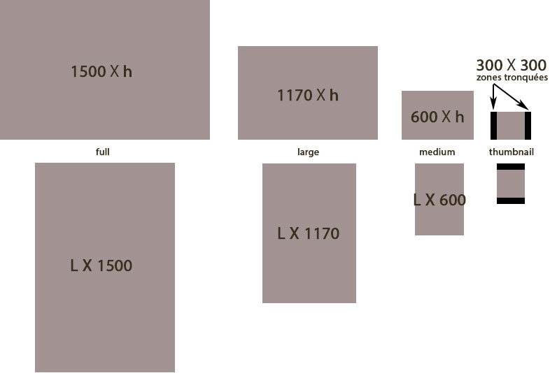 Ci-dessous un schéma des différentes tailles générées à partir d’une image au format portrait ou d’une image au format paysage :