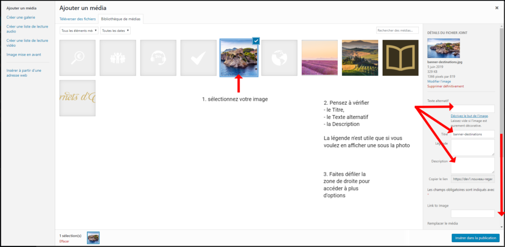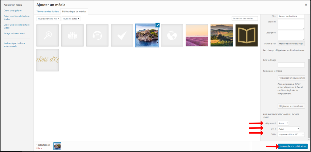 Lorsque vous avez sélectionné votre image, avant de valider son insertion, vous pouvez ajuster les paramètres :