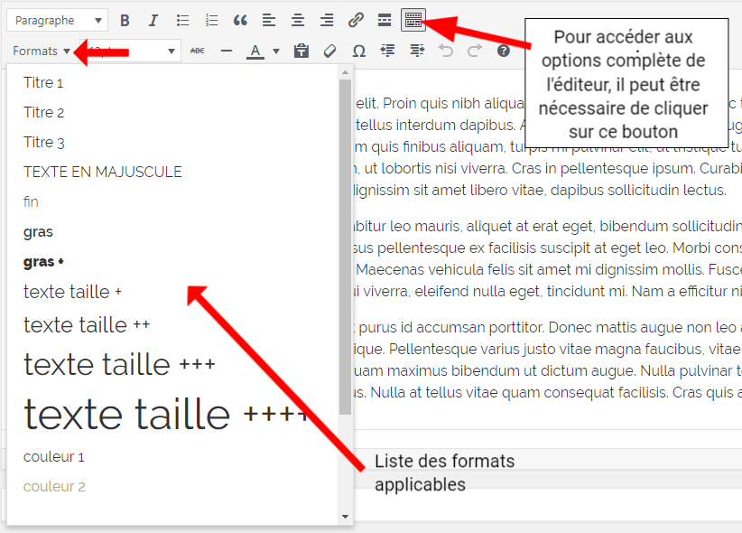 Note importante : Les formats permettent de simuler des niveaux de titre. Cela permet d’appliquer tous les styles d’un niveau de titre (couleur, taille,…) sans perturber la hiérarchie de votre contenu pour les moteurs de recherche (Voir les niveaux de titre pour plus d’information).