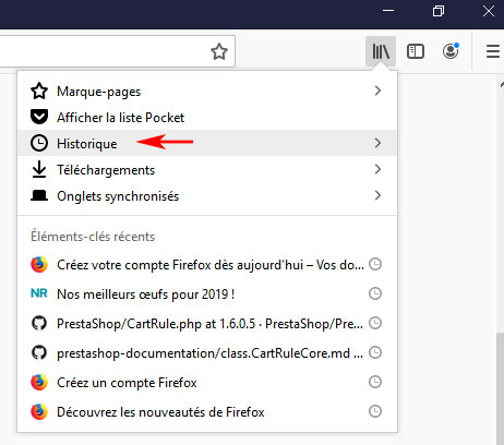 - Cliquez sur le menu historique de Firefox (les quatre barres verticales en haut à droite, symbolisant des archives).