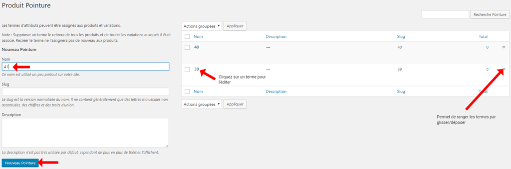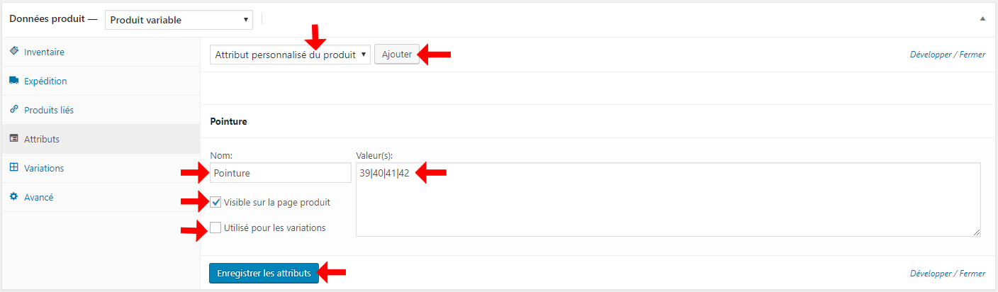 Pour créer un attribut et ses valeurs (Ex : Pointure en 39, 40, 41 et 42) :