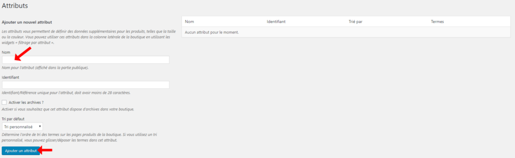- Dans l’onglet Produits > Attributs, l’encart de gauche permet d’ajouter un nouvel attribut. L’encart de droite liste les attributs existants.