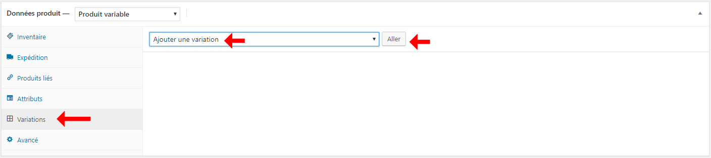 Pour ajouter une variation, allez dans la section variations dans les données produit. Sélectionnez Ajouter une variation, puis Cliquez sur Aller.