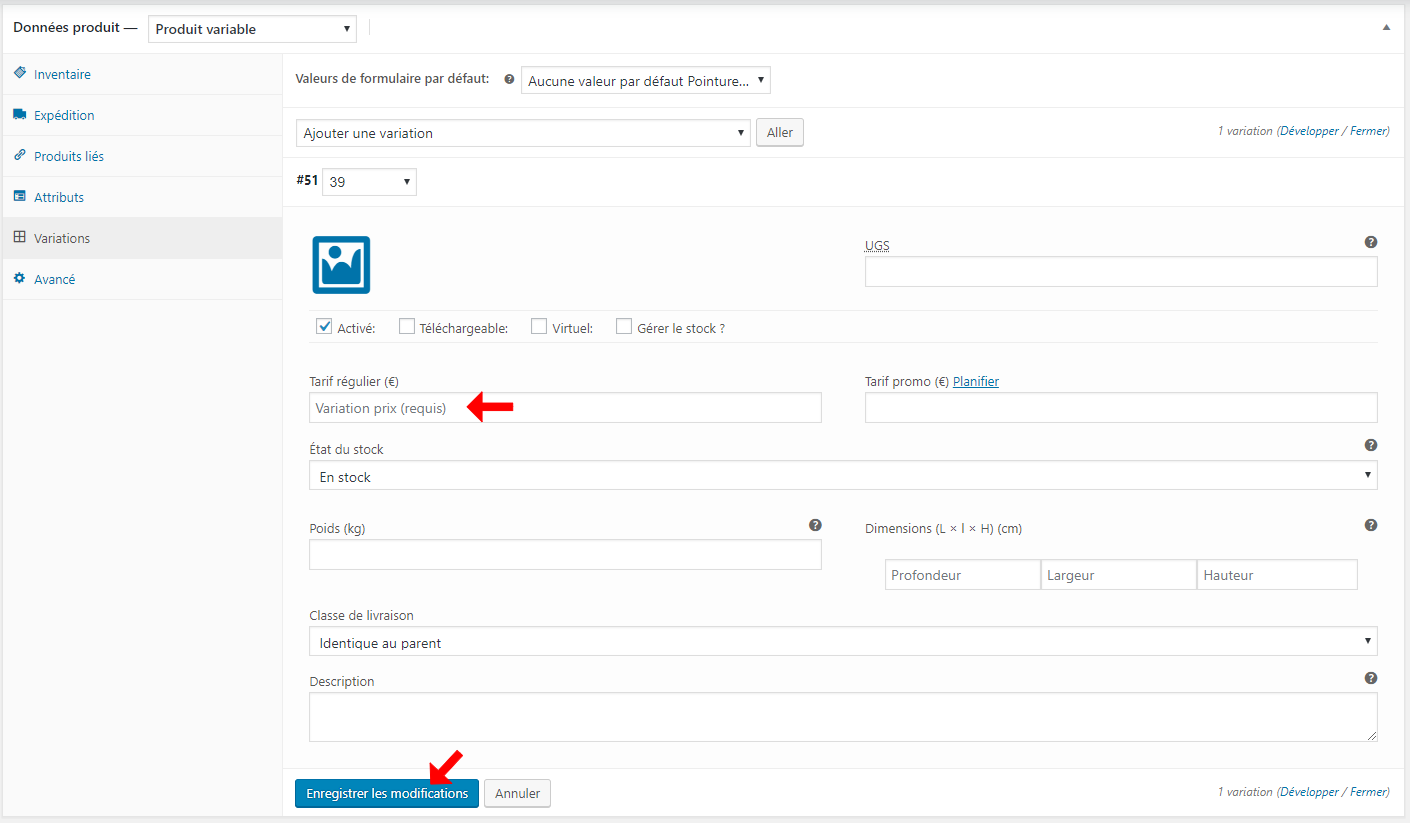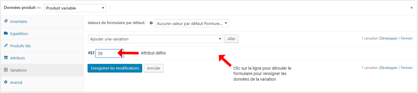 Par exemple, Si vous ajoutez une variation pour une paire de chaussure, il faudra préciser l’attribut pointure qui permet de définir la variation. Exemple : Variation 1 = chaussure pointure 39 ; variation 2 = chaussure pointure 40 …